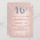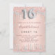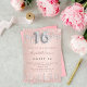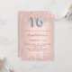 A modern, stylish and glamourous invitation for a girl's Sweet 16, 16th birthday party. A rose gold gradient background with rose gold and faux silver drips. The name is written with a modern dark rose gold coloured hand lettered style script. Personalise and add your party details. Number 16 is written with a silver balloon style font, script.