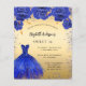 A modern, stylish and glamourous invitation for a Sweet 16, 16th birthday party. A faux gold background with faux blue sparkles and a royal blue dress and roses, florals. The name is written with a modern hand lettered style script. Personalise and add your party details.