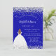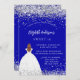 A modern, stylish and glamourous invitation for a Sweet 16, 16th birthday party. A royal blue background with faux glitter dust, a girl wearing a ball gown. The name is written with a modern hand lettered style script. Personalise and add your party details.