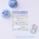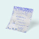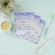 A faux silver looking background. Decorated with royal blue confetti, sparkles. Personalise and add a name and party details. The name is written with a hand lettered style script.