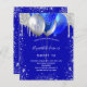 A royal blue background. Decorated with faux silver glitter drips paint dripping look, sparkles and balloons. Personalise and add a name and party details. The name is written with a hand lettered style script.