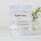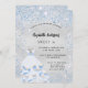 For an elegant Sweet 16, 16th birthday. A faux silver metallic looking background. Decorated with blue faux glitter dust and a dress for a winter wonderland themed party. Personalise and add a name, age and party details. The name is written with a hand lettered style script