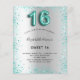 A modern, stylish and glamourous invitation for a girl's Sweet 16, 16th birthday party. A faux silver looking background, decorated with teal coloured glitter dust. Personalise and add your name nad party details. Number 16 is written with a balloon style font, script.