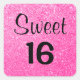 Sweet 16 square sticker with glam hot pink glitter sparkles and bold black writing.