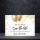 A chic white background decorated with faux gold glitter and balloons. Personalise and add a date and name/age. The text: Save the Date is written with a large trendy hand lettered style script.