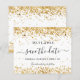 A girly and trendy Save the Date card for a Sweet 16, 16th birthday party. A stylish white background decorated with faux gold confetti. Personalise and add a date and name and text. The text: Save the Date is written with a large trendy hand lettered style script with swashes.