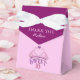 Personalised pretty pink sweet sixteen birthday party favour boxes with a pink tiara topped with a purple heart and Sweet 16 written underneath. Customise with your own message and teenager's name to pass out to guests.