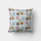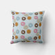 This delightful throw pillow features a sweet and yummy design. Colourful illustrated doughnuts are tiled across a light blue background. The chocolate frosting doughnut takes centre stage, while cute blue, pink, and white frosted doughnuts with rainbow sprinkles are placed around it.