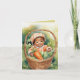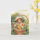 A delightful watercolor illustration of a smiling baby nestled in a large woven basket filled with leafy greens and a bright orange carrot. The baby is dressed in a cosy orange outfit with white trim and a matching plaid bonnet. The background features soft greenery and warm light, adding to the cheerful, garden-fresh feel of the scene.