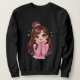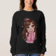 A charming, anime-style illustration of a young girl with long, flowing brown hair styled in a soft half-up bun tied with a pink ribbon. She has large, sparkling brown eyes, rosy cheeks, and a joyful, open smile that radiates warmth and innocence. Dressed in a cozy off-shoulder pink sweater with long sleeves covering her hands, she rests her chin gently on her fists in an excited, affectionate pose. Small pink hearts and subtle sparkles float around her against a dark background, enhancing the sweet, dreamy atmosphere. The overall mood is cute, cheerful, and full of gentle, heartwarming emotion. 💗✨