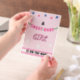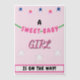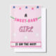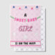 A sweet baby girl is on the way. Typography in pink and black. Pinkish, blue and white outlined stars. Pastel pink semi-transparent background.