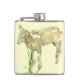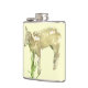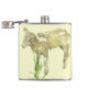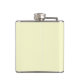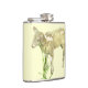 This flask displays a sweet baby lamb just three weeks old. He is munching on grass against a yellow background.