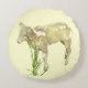 This round pillow features a sweet little lamb just three weeks old. He is munching on grass against a yellow background.