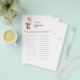 This adorable baby shower game features a charming watercolor illustration of a bear holding onto a soft pink balloon. The game prompts guests to guess what baby items the mom-to-be has chosen for each letter of the alphabet. It's a fun and engaging way to celebrate the upcoming arrival and learn about the little one's nursery essentials. The design has a neutral, earthy color palette, making it perfect for any baby shower theme. Add a touch of sweetness to your celebration with this unique baby item alphabet game.