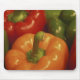 Colourful photograph of yellow, red and green sweet bell peppers on a mouse pad.