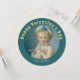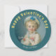 Round Valentine greeting card inspired by a beautiful pastel style child portrait by French Rococo painter Jean-Honoré Fragonard (A boy as Pierrot, c.1785). It shows a fair-haired little boy in a white over-sized Pierrot's costume. The boy has a happy expectant expression and he carries some red and blue flowers in his arms.