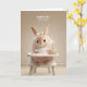 An adorable baby bunny dressed in a soft pink outfit sits in a high chair, celebrating her first birthday with a tiny cake and candle. Set against a warm neutral background, this charming design captures the innocence and sweetness of a baby’s very first milestone. A perfect card for celebrating a little girl’s first birthday with a soft, cozy, and heartfelt touch.