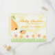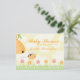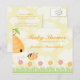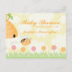 This baby shower party invite postcard has an adorable little bumblebee flying on the right with a hive on the left. The bottom has a pink and orange flowers border with a yellow clouds background. Copyright JD Digi Designs