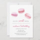 Adorable blush pink and white invitations for your little girl's birthday party feature a trio of pastel pink watercolor macaron cookies, with "join us for a sweet celebration" in whimsical pink script lettering. Personalise with your birthday party details beneath. Cards reverse to solid light pink. Perfect for Paris-themed or dessert theme birthday celebrations.