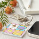 Satisfy your sweet tooth with this colourful pattern featuring tasty treats like a chocolate ice cream cone, a purple frosted chocolate doughnut, a lemon yellow macaron, and a pink and white swirled lollipop separated by chocolate chips and surrounded by rainbow sprinkles on four brightly hued squares.