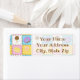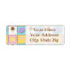 Satisfy your sweet tooth with this colourful pattern featuring tasty treats like a chocolate ice cream cone, a purple frosted chocolate doughnut, a lemon yellow macaron, and a pink and white swirled lollipop separated by chocolate chips and surrounded by rainbow sprinkles on four brightly hued squares. Customise address details on this return label to make it uniquely your own. You can also choose from standard address and shipping sizes for the label.