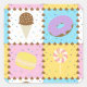 Satisfy your sweet tooth with this colourful pattern featuring tasty treats like a chocolate ice cream cone, a purple frosted chocolate doughnut, a lemon yellow macaron, and a pink and white swirled lollipop separated by chocolate chips and surrounded by rainbow sprinkles on four brightly hued squares.