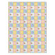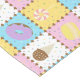 Satisfy your sweet tooth with this colourful pattern featuring tasty treats like a chocolate ice cream cone, a purple frosted chocolate doughnut, a lemon yellow macaron, and a pink and white swirled lollipop separated by chocolate chips and surrounded by rainbow sprinkles on four brightly hued squares.