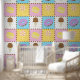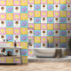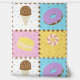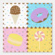 Satisfy your sweet tooth with this colourful pattern featuring tasty treats like a chocolate ice cream cone, a purple frosted chocolate doughnut, a lemon yellow macaron, and a pink and white swirled lollipop separated by chocolate chips and surrounded by rainbow sprinkles on four brightly hued squares.