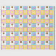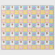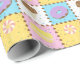 Satisfy your sweet tooth with this colourful pattern featuring tasty treats like a chocolate ice cream cone, a purple frosted chocolate doughnut, a lemon yellow macaron, and a pink and white swirled lollipop separated by chocolate chips and surrounded by rainbow sprinkles on four brightly hued squares.