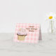 Whimsical birthday greeting card, with a pretty chocolate cupcake decorated, with pink frosting, and colourful hearts, set on a pink and white gingham background. Fun brown text, at the top reads, Sweet Happy Birthday Wishes. Personalise the text inside and out with your own greeting and name.