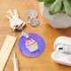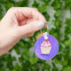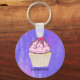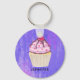 Keychain personalised with a name and designed with an illustration of a delicious looking cupcake. Pink frosting and chocolate drizzles. A yellow cupcake holder and a raspberry on top. Yummy! The background is a purple abstract texture with little hearts sprinkled around.