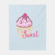 A blanket with an illustration of a delicious looking cupcake. Pink frosting and chocolate drizzles. A yellow cupcake holder and a raspberry on top. Yummy!