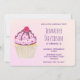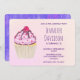 A birthday party invite with an illustration of a delicious looking cupcake. Pink frosting and chocolate drizzles. A yellow cupcake holder and a raspberry on top. Yummy! The back sidehas a purple abstract texture with little hearts scattered around.