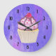 A clock with an illustration of a delicious looking cupcake. Pink frosting and chocolate drizzles. A yellow cupcake holder and a raspberry on top. Yummy!