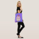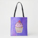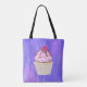 A tote bag with an illustration of a delicious looking cupcake. Pink frosting and chocolate drizzles. A yellow cupcake holder and a raspberry on top. Yummy!  The background is a purple abstract texture with little hearts peppered throughout.