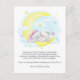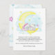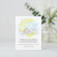 A charming watercolor illustration of a baby elephant peacefully sleeping on a crescent moon, surrounded by fluffy clouds and twinkling pastel stars. The soft colour palette of yellows, blues, and pinks creates a dreamy and whimsical atmosphere, perfect for a baby shower invitation. Ideal for a gender-neutral or baby girl celebration, this design evokes warmth, love, and the anticipation of welcoming a new little one.
