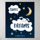 Sweet wall art for your boy's nursery room. Illustration of clouds with a bunny peeking her head out of one of them. There is text inside the clouds that says "sweet dreams" in fun typography. You can add your child's name at the bottom. There are gold shimmery moon and stars on a navy blue background. Original illustration and design by Namibear Art Studio.©Namibear
