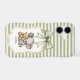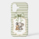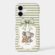 This charming design features a heartwarming scene of a baby elephant and a teddy bear snuggled together, evoking feelings of warmth and friendship. The illustration is set against a soothing pastel green and cream striped background, accented with a delicate sage green bow and a decorative frame. It's perfect for anyone who loves cute animal art and wants to add a touch of tenderness to their device. The gentle watercolor style and soft color palette make this a delightful choice for a phone case that brings joy and a smile every day.