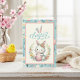 This sweet pastel coloured Easter card features a cute little bunny rabbit in a wreath of flowers while holding a cute pink coloured decorated Easter egg. The words "Happy Easter" are in a blue and pink vintage-style graphic with bunny ears on top. Personalise by customising the message on the inside and/or adding your names - or leaving that part blank if you wish to add handwritten signatures later.