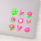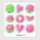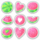 Sweet and fresh summer sticker. Bright watermelon slices, hearts and seeds. Pink and green colours.