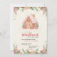 Delightfully sweet Baby Shower invitation featuring a charming pink gingerbread house adorned with candy details, surrounded by pastel sweets, peppermint swirls, and soft whimsical accents. Perfect for a baby girl celebration, this invitation brings a playful, sugary, and magical touch, ideal for a fun, family-friendly baby shower filled with joy and sweetness.