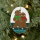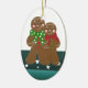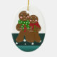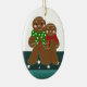 A cute design featuring two gingerbread men cookies with smiley faces and big holiday bow around their necks. A border of deep green with white holiday stars.