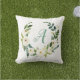 Custom made to order outdoor throw pillows personalised with your text. This boho farmhouse pillow design is personalised with your monogram initial or other custom text in a green watercolor floral wreath. Use the design tools to add photos, change the background colour, and edit the text fonts and colours to create a unique one of a kind monogrammed pillow.