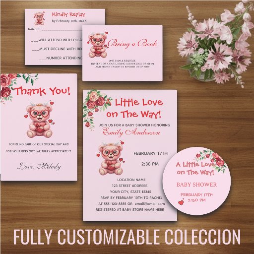 Celebrate your baby shower with this charming pink teddy bear design featuring adorable heart-shaped glasses. Perfect for a baby girl shower, this sweet illustration adds a playful and modern touch to your invitations, cards, or party stationery.