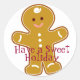 Holiday baked goods sticker features smiling gingerbread man with a cheery Sweet Holiday message. Decorate cards, gifts, baked goodies with cute cookie boy stickers suitable for Thanksgiving, Christmas, Hanukkah or New Year celebrations.