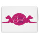 Two Great Danes laying down behind written bullet in the centre. Magenta the colour of the print.