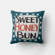 A cute typographic food design that says "Sweet Honey Bun". It's black and red text on a rectangle with funky, playful white dots surrounding it, all on a teal background.