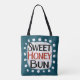A cute typographic food design that says "Sweet Honey Bun". It's black and red text on a white rectangle with funky, playful white dots surrounding it, all on a teal background.