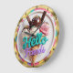 This circular wall clock features a delightful ice cream cone overflowing with four scoops of ice cream. Each scoop is topped with sprinkles and chocolate wafers. The phrase "Hello Friends" is prominently displayed in playful, bubbly font, with "Hello" in blue-green and "Friends" in purple. The clock face has a colourful, striped border in pastel shades, encased in a golden frame.