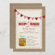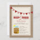 A sip and see invitation featuring red bunting at top and an illustration of a mason jar of sweet iced tea with lemon at bottom left. Background on front and back is burlap inspired. Front features lace inspired design. Personalise the text with your information.